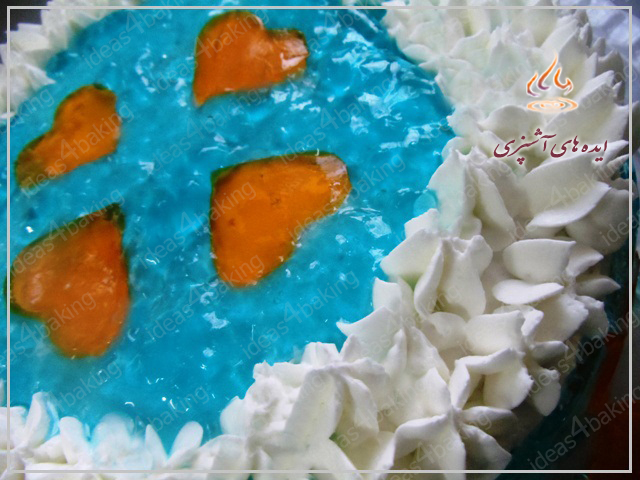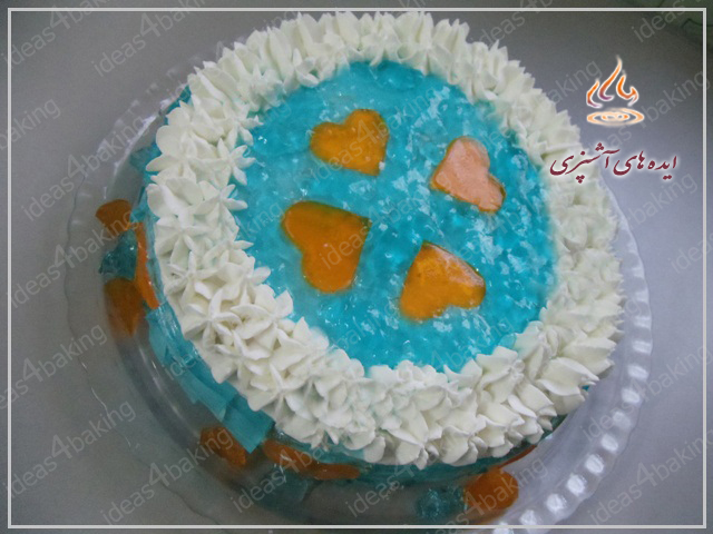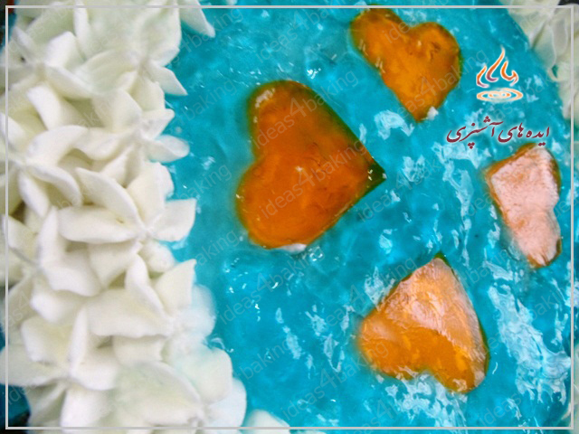 * من از ژله نارنجی هم برای قلب هام استفاده کردم! با قالب قلب قالب زدم و رو خامه چسبوندم و بعد بقیه کیک رو با مربع مستطیل های آبی پر کردم!!تو خونه ژله قرمز نداشتم! ولی خب به قول همسری همینجوری یه تبلیغی هم واسه همراه اول کردم!!