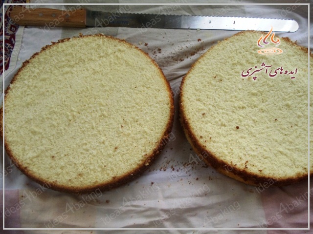 * لایه بعدی کیک رو میذاریم روی لایه اول و دوباره مرطوب میکنیم و خامه میکشیم .خیلی نیازی نیست صافش کنید